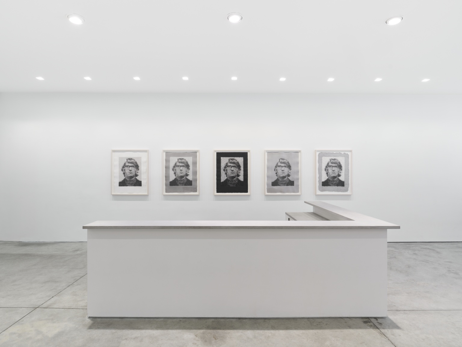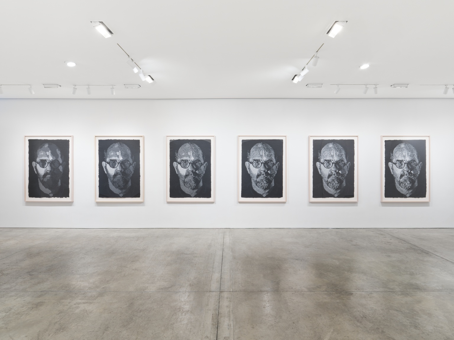 After Wilfer’s death in 1995, Close returned to paper-pulp in 2001 to create Self Portrait/Pulp (2001). This time working with Ruth Lingen, founding director of Pace Paper, who had been Wilfer’s assistant during the creation of Close’s paper-pulp works from the early 1980’s. Lingen brought her own innovations to Close’s multiples by utilizing mylar sheets to build up overlapping layers of paper-pulp. A progressive proof of Self Portrait/Pulp (2001) is included in the exhibition, showcasing this process.