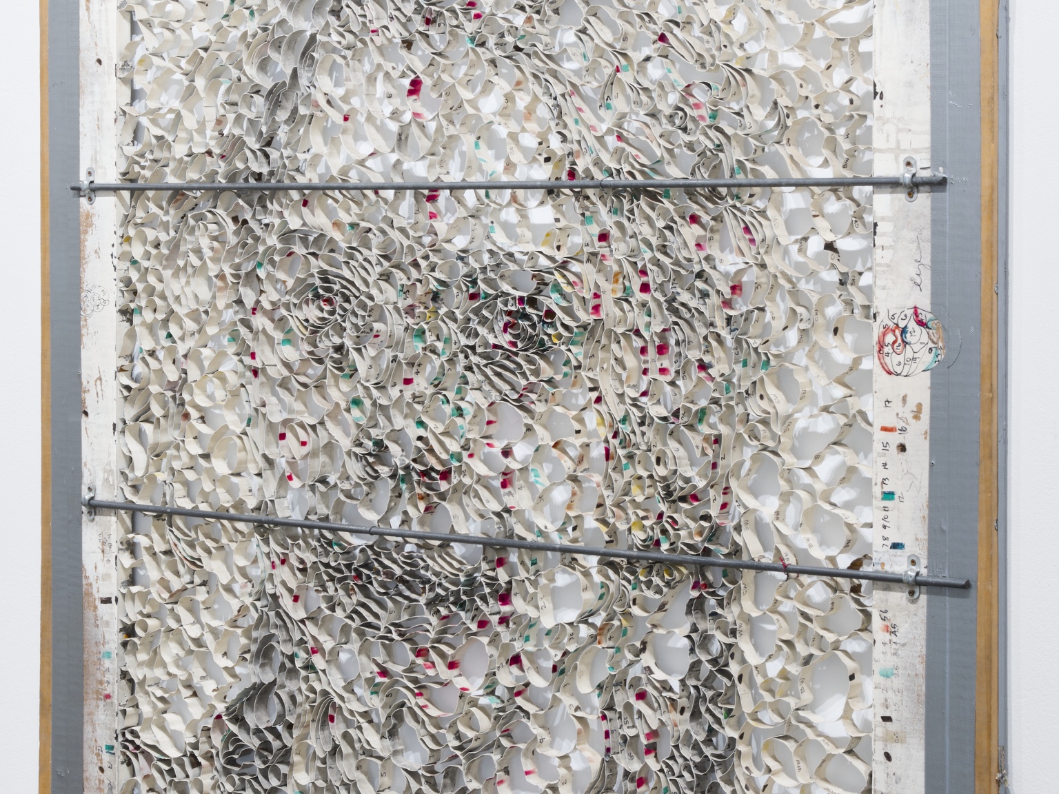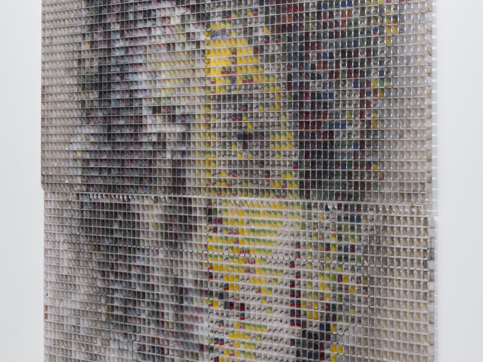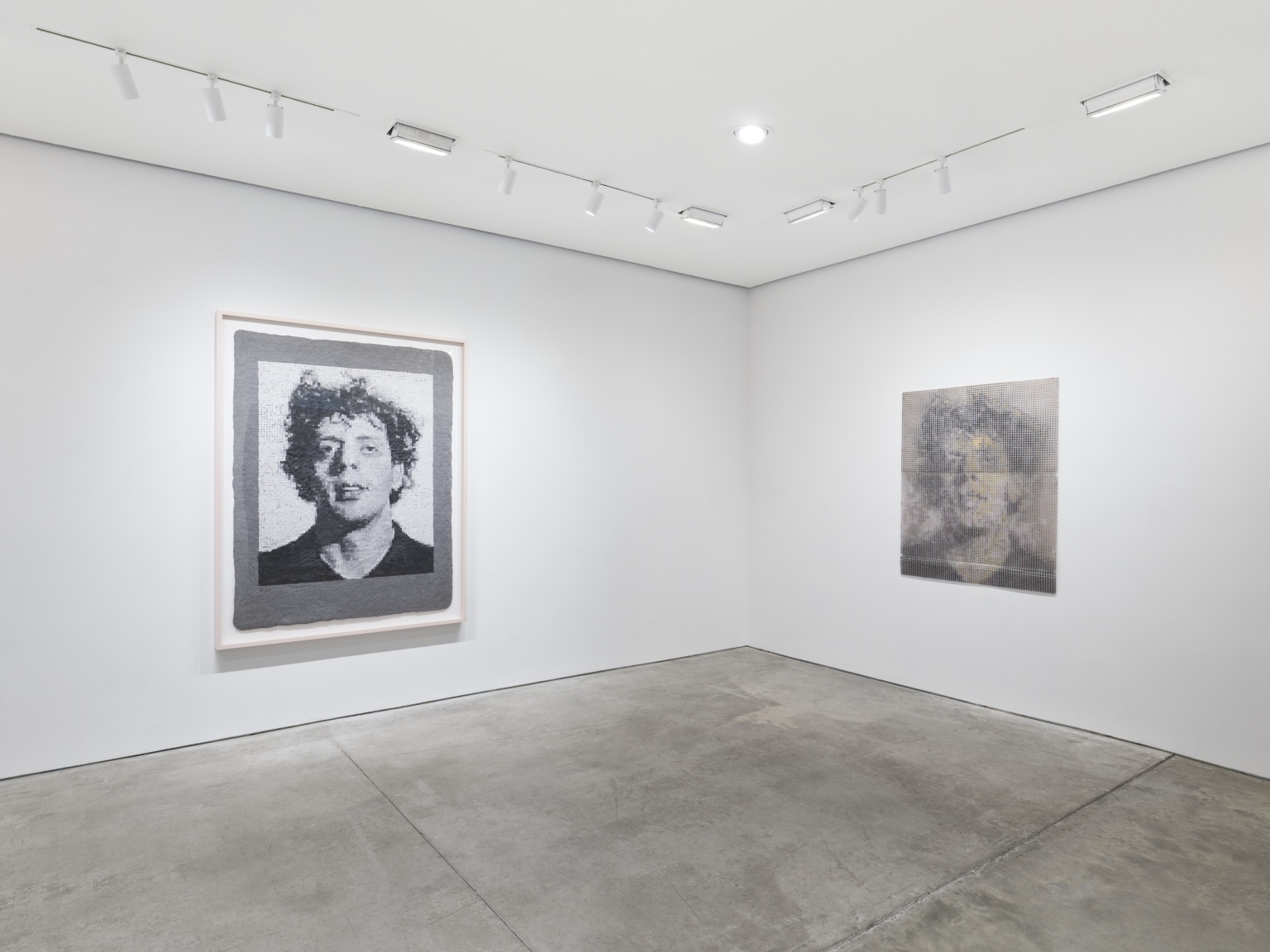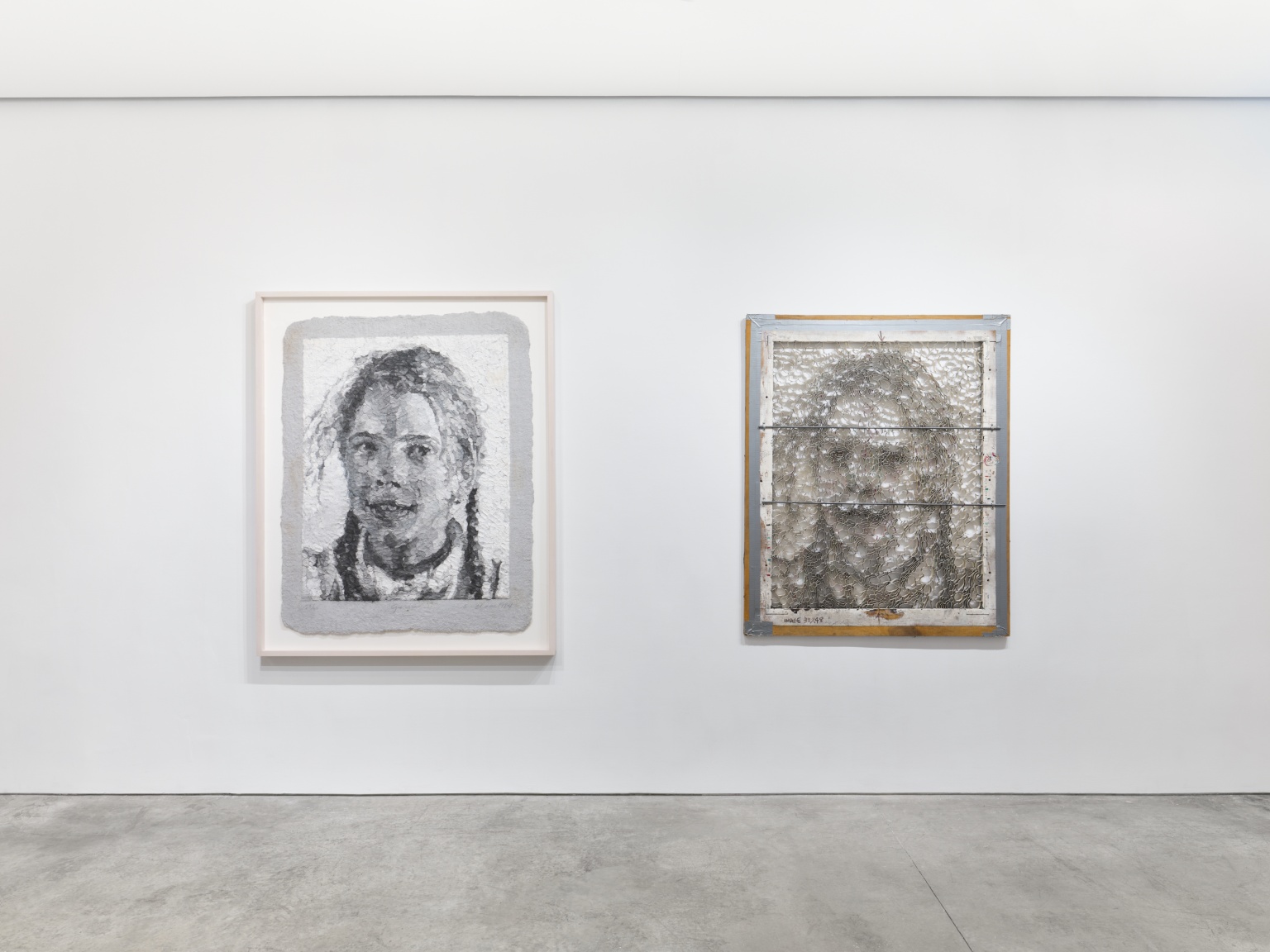 Of the many innovations Wilfer introduced to Close’s papermaking, the usage of large-scale gridded stencils was essential to achieving the artist’s exacting specifications for his work. Several of these grids are included in the exhibition, from early ready-made screens for Robert (1982) and Phil (1982), utilizing commercially available fluorescent light covers, to a later custom-built brass shim apparatus for Georgia (1984). These grids mirror the systems with which Close was able to paint his early photorealistic work, and foreshadow developments in his paintings, which increasingly revealed and relied upon deconstructed gridded compositions throughout his later career.