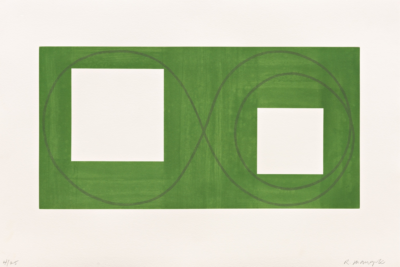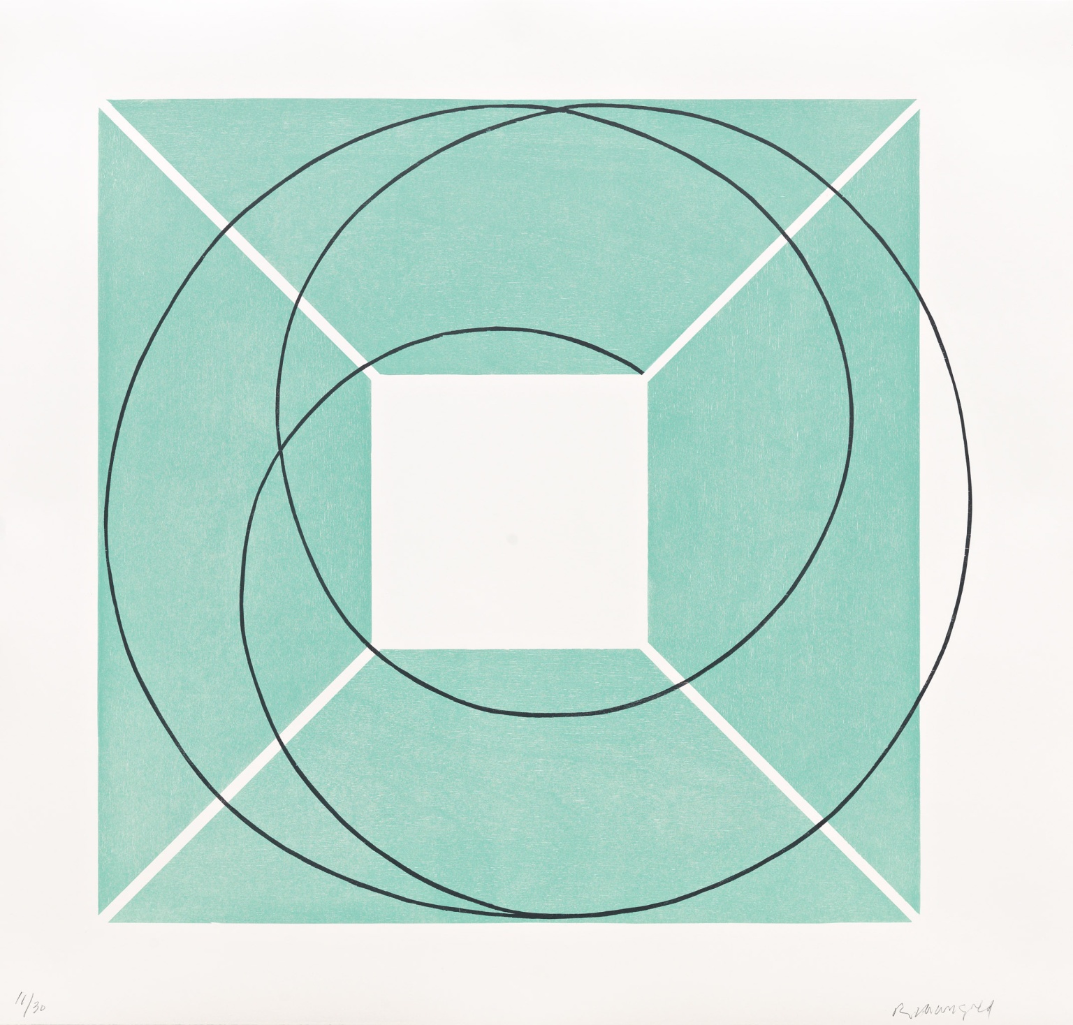 Robert Mangold’s work investigates approaches to composition in addition to the relationship between an image and its background. In Mangold’s print work he contrasts bold geometric shapes with hand-drawn lines on muted planes of color. Mangold’s work has received international acclaim and is featured in public collections including the Guggenheim, the Art Institute of Chicago, MoMA, and the Tate Gallery, London.