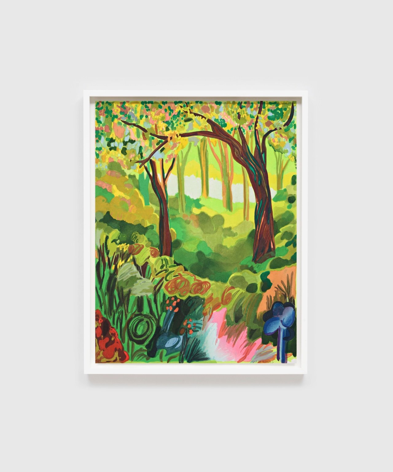 Shara Hughes uses dizzying brushwork, vibrant colors, and shifting perspectives to make paintings that defy many of the existing conventions associated with the landscape genre. Natural motifs and patterned elements recur throughout Hughes’s pictures: snake-like trees, floating moons, distorted reflections in bodies of water, and stippled night skies appear in various permutations, synchronized with harder-to-define forms in which abstract and representational impulses co-exist in unorthodox harmony. Hughes’s process rarely involves reference images; instead, she transposes the psychological complexity of her interior world into lush and layered compositions. She often mixes pigment directly atop her surfaces, and in this way creates intuitive, one-of-a-kind color palettes that simultaneously point to art historical movements like color field painting and Post-Impressionism. As she engages with these open-ended experiments in image-making, Hughes depicts kaleidoscopic visions of flora and fauna in processes of constant evolution.